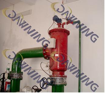 现场安装图,图中立式自清洗过滤器室内安装,下进侧出,右边小管道与排污口连接方便导出排出的杂质。